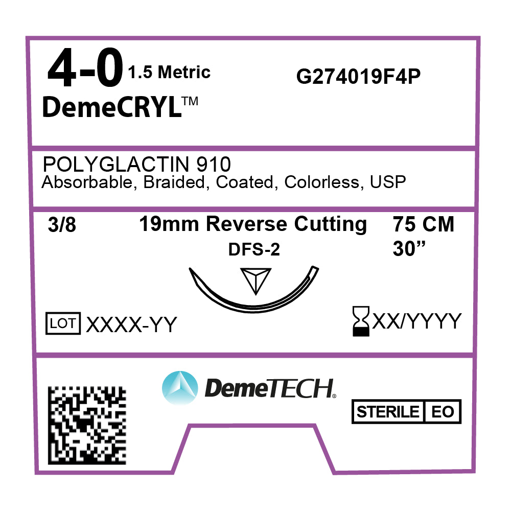 DemeTECH's Polyglactin 910 is a sterile, synthetic absorbable suture made from copolymers consisting of 90% glycolide and 10% L-lactide. Its chemical formula is represented as (C2H2O2)m(C3H4O2)n. Clinical studies indicate that two weeks post-operation, about 75% of the suture's original strength is retained, and by the fourth week, around 25% of its linear tensile strength remains.